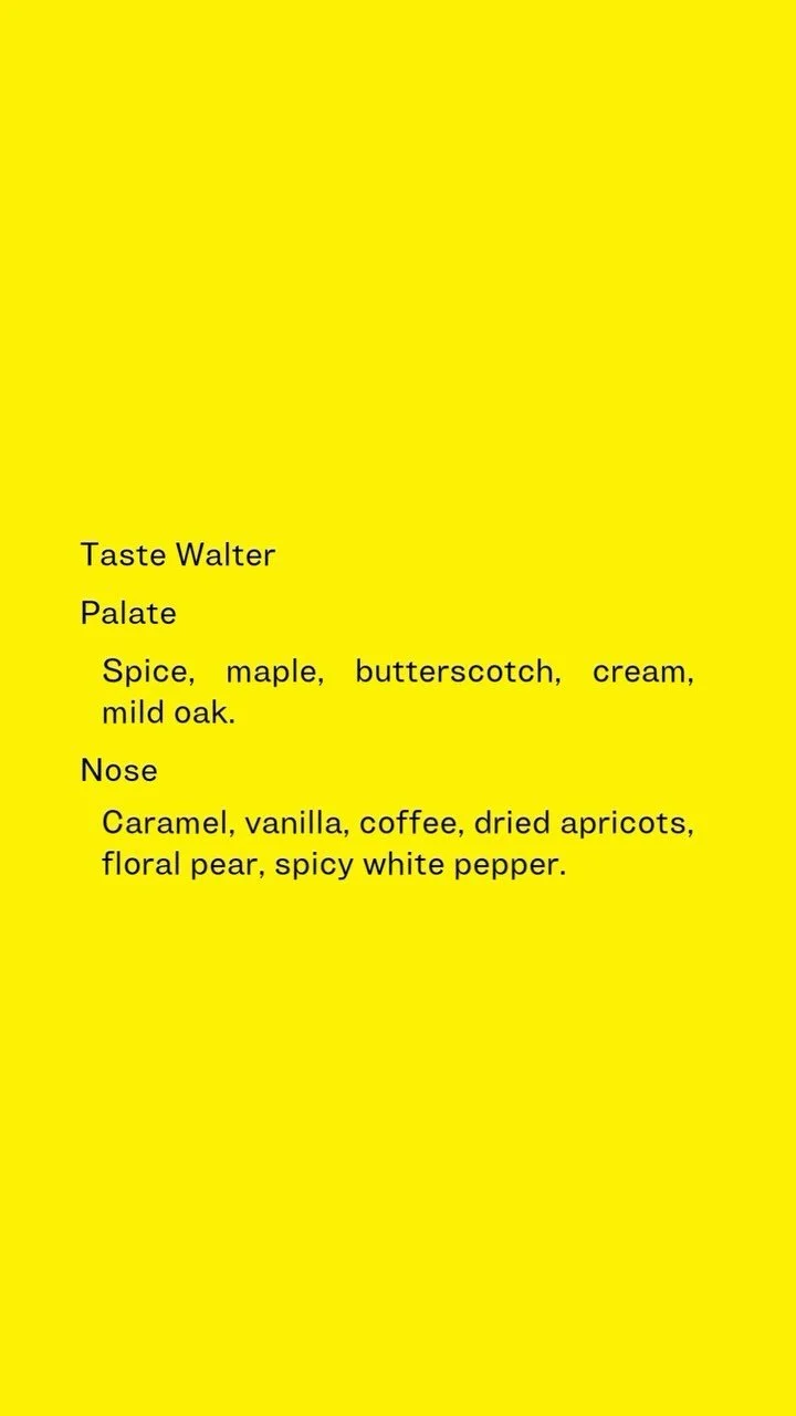 On the nose, Walter brings notes of caramel, vanilla, coffee, dried apricots, floral pear and spicy white pepper.